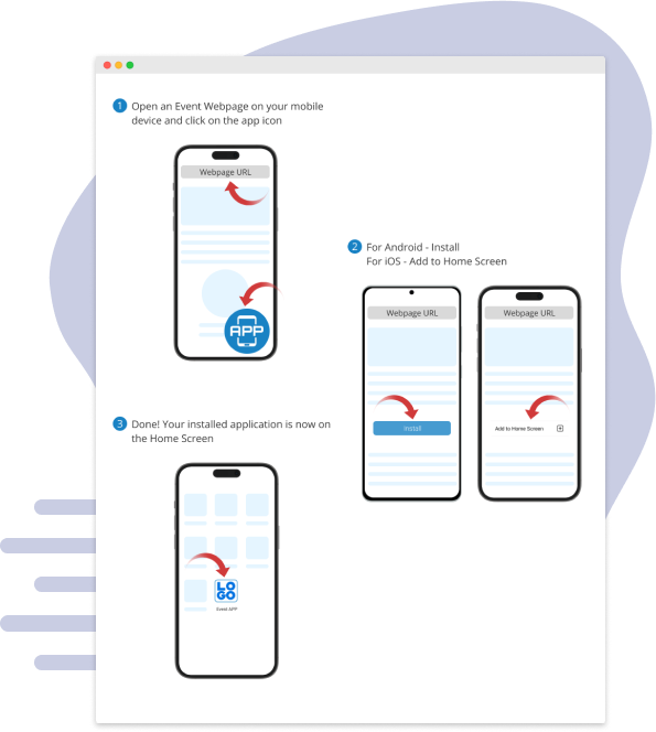 Give your attendees direct access to the mobile app, which is published along with the event webpage. Provide a web version of the app for those who can't or don't want to install it.